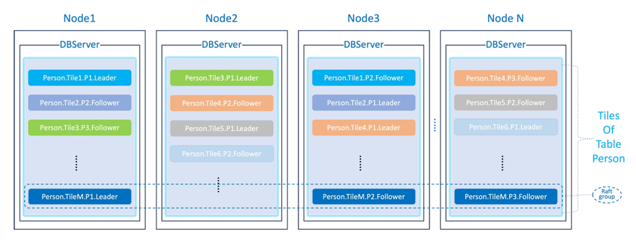 BigInsights有效的基于Tile模式进行数据分片机制,每张表被分成很多个 tiles,tile是数据分布的最小单元,通过在节点间搬运 tile以及 tile的分裂与合并,就可以实现几乎无上限的 scale out。每个 tile有多个副本,形成一个 Raft Group,通过 Raft 协议保证数据的高可用和持久性,Group Leader 负责处理所有的写入负载,其他 Follower 作为备份,数据分布模式参照图三。MServer 节点会负责协调 tile的搬运、分裂等操作,保证集群的负载均衡,这些操作是直接基于 Raft Group 实现。