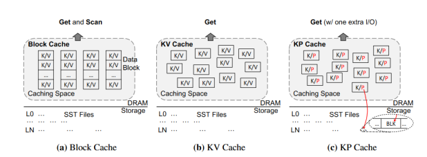 针对键值存储系统共存在三种缓存模式,分别为KV(键值缓存)、KP(键值指针缓存)和Block(块缓存)。