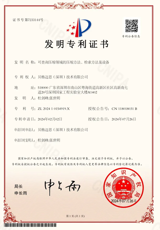 可见,现有的大量数据压缩存储技术都不能充分利用关系型数据库中的数据特性进行无需解压还原的可查询压缩。为解决这一难题,贝格迈思创新性地研发了分布式智能数据库系统AiSQL,其内置的可查询压缩技术能够充分依托关系型数据的特性实现压缩,同时不需要针对压缩数据进行解压还原就能精确回答用户的查询,从而为数据库提供了低成本的存储能力和高性能的查询回答能力。该项可查询压缩技术已经成为公司的发明专利技术《可查询压缩领域的压缩方法、检索方法及设备》(专利号ZL 2024 1 0154919.X),通过国家知识产权局实质审查并授权(授权公告号CN 118018031 B)。